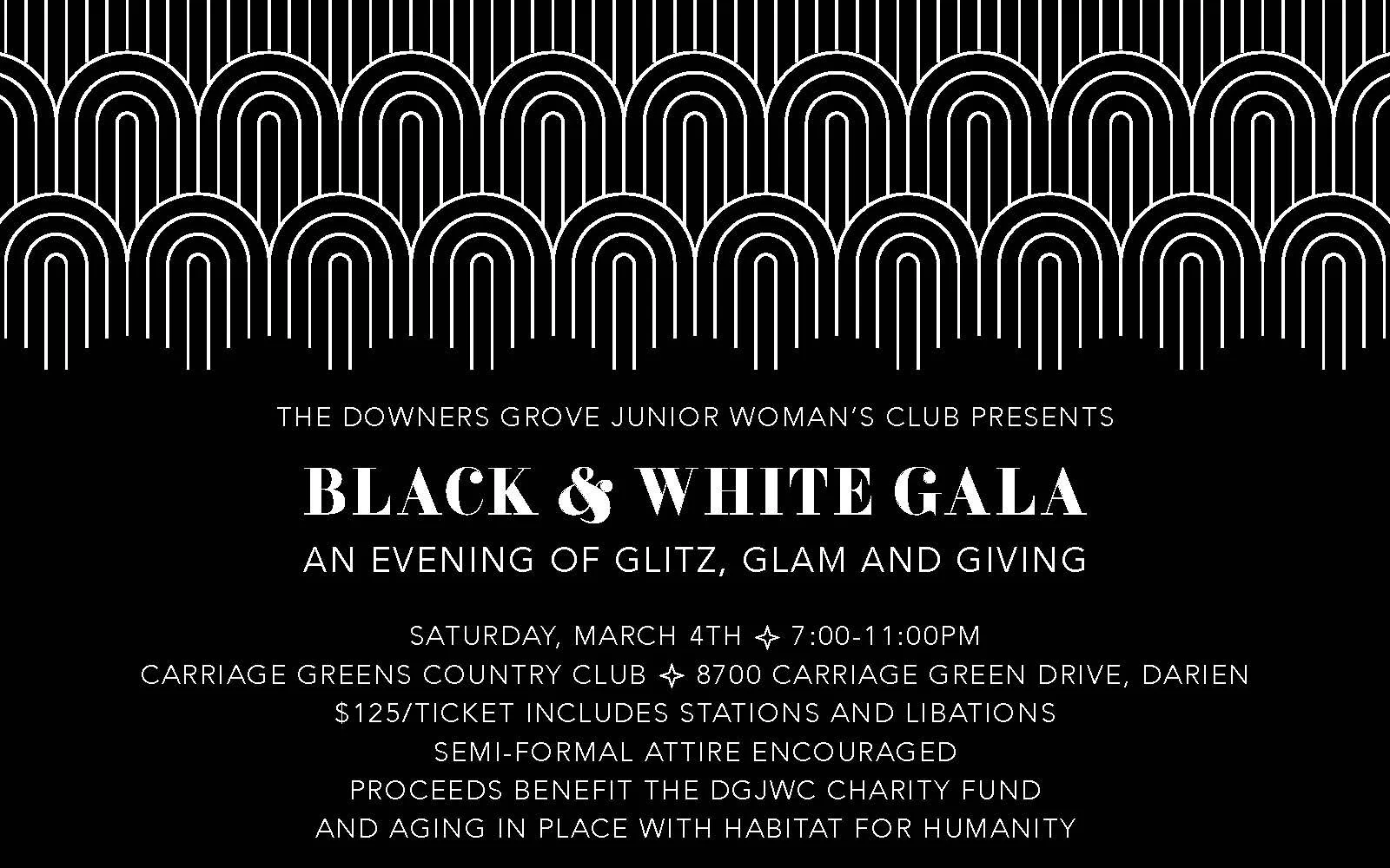 Join the Downers Grove Junior Woman's Club at the Black & White Gala: An Evening of Glitz, Glam and Giving on Saturday, March 4th, 2023 at Carriage Greens Country Club from 7:00pm-11:00pm. Tickets include heavy appetizers, 3 hours of open bar, music by Big Cat DJ Services, casino tables, raffles, silent auction and MORE! Semi-formal attire encouraged.
