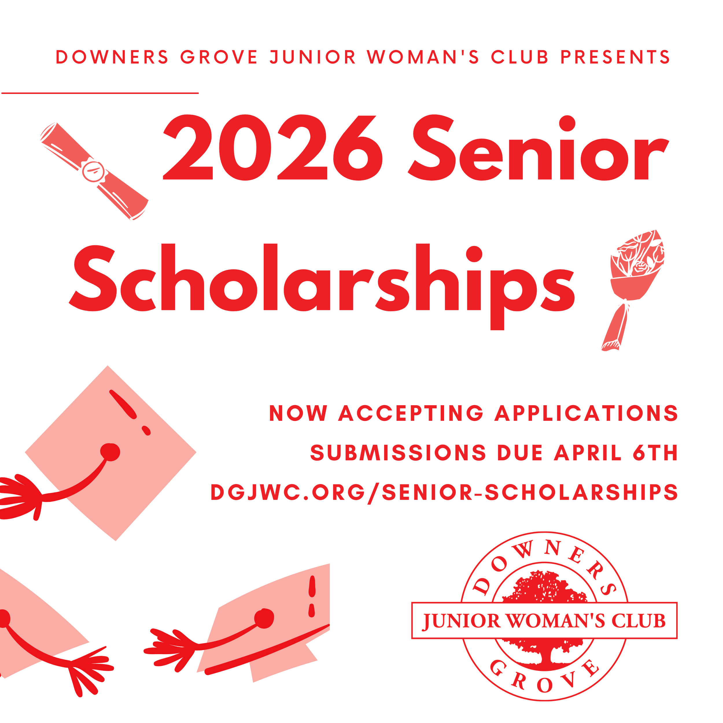 Scholarship recipients are invited to attend the Downers Grove Junior Woman’s Club’s scholarship presentation ceremony at the April General Meeting.